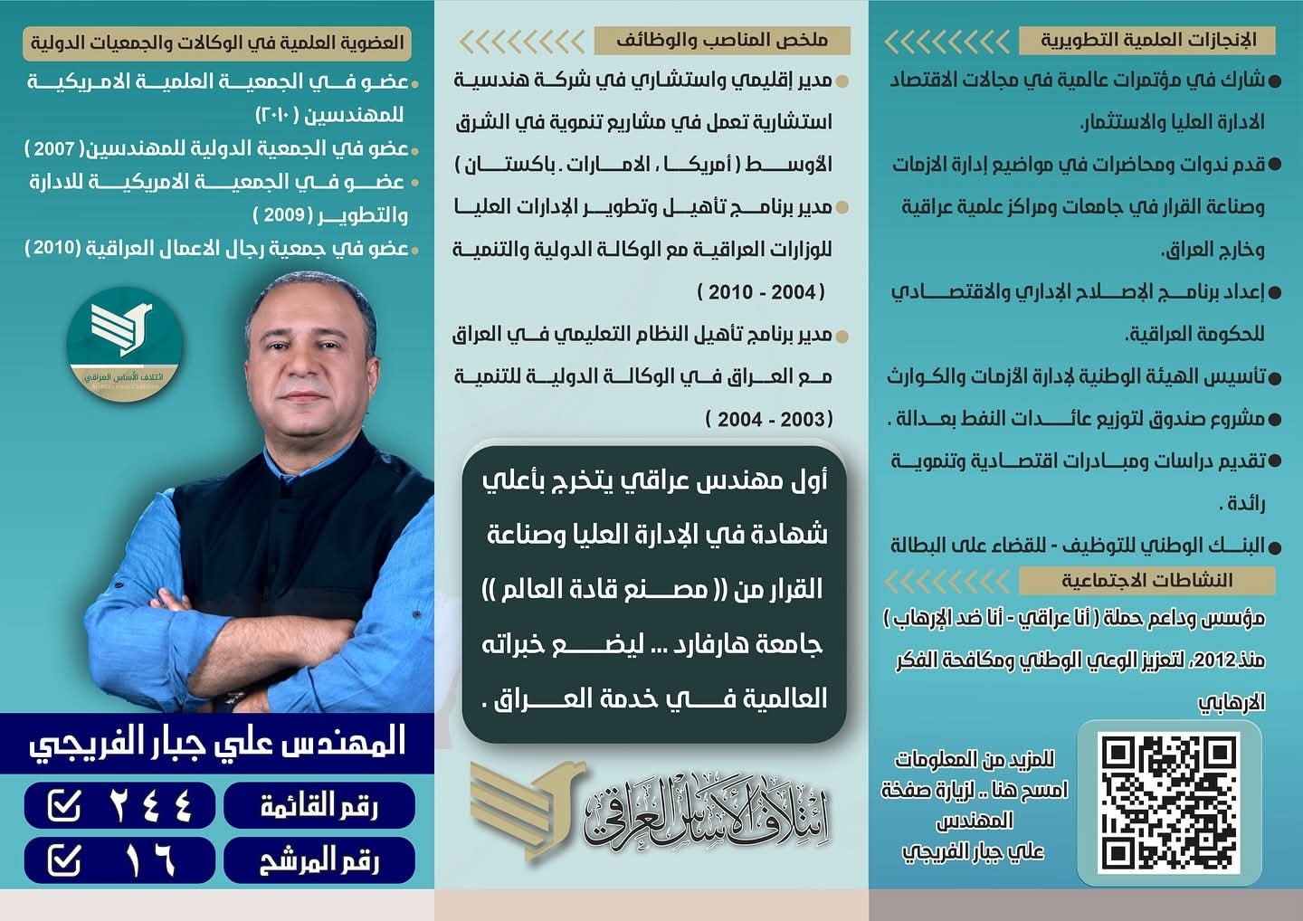 عن ائتلاف الأساس العراقي – رقم الكتلة 244 – تسلسل 16، يبرز المهندس علي جبار الفريجي كأحد الوجوه العراقية المتميزة التي جمعت بين الخبرة الأكاديمية والقيادة الميدانية، ليكون نموذجًا للمهندس الذي لا يكتفي بالتنظير، بل يصنع الحلول على أرض الواقع.