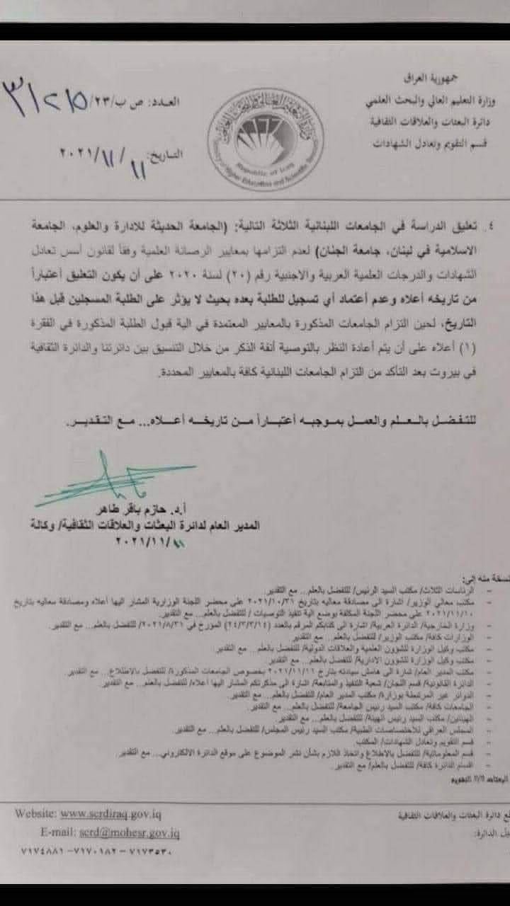 جامعة الجنان في لبنان تُعلق قبول الطلبة العراقيين منذ 2021 وتمنح استثناءً مثيراً للجدل لمحافظ كربلاء