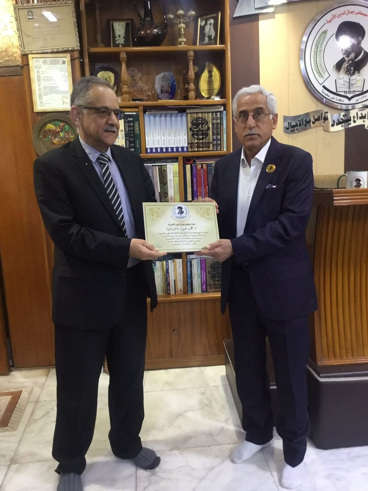 وفي ختام الأمسية أجاب المحاضر عن أسئلة ومداخلات الحاضرين، ثم قامت الرابطة بتكريم ضيفها الدكتور محمد جواد البدراني بمنحه شهادة مصطفى جمال الدين التقديرية، قدّمها له رئيس الرابطة، تقديراً لعطائه العلمي ومشاركته في إحياء هذه الأمسية الثقافية.