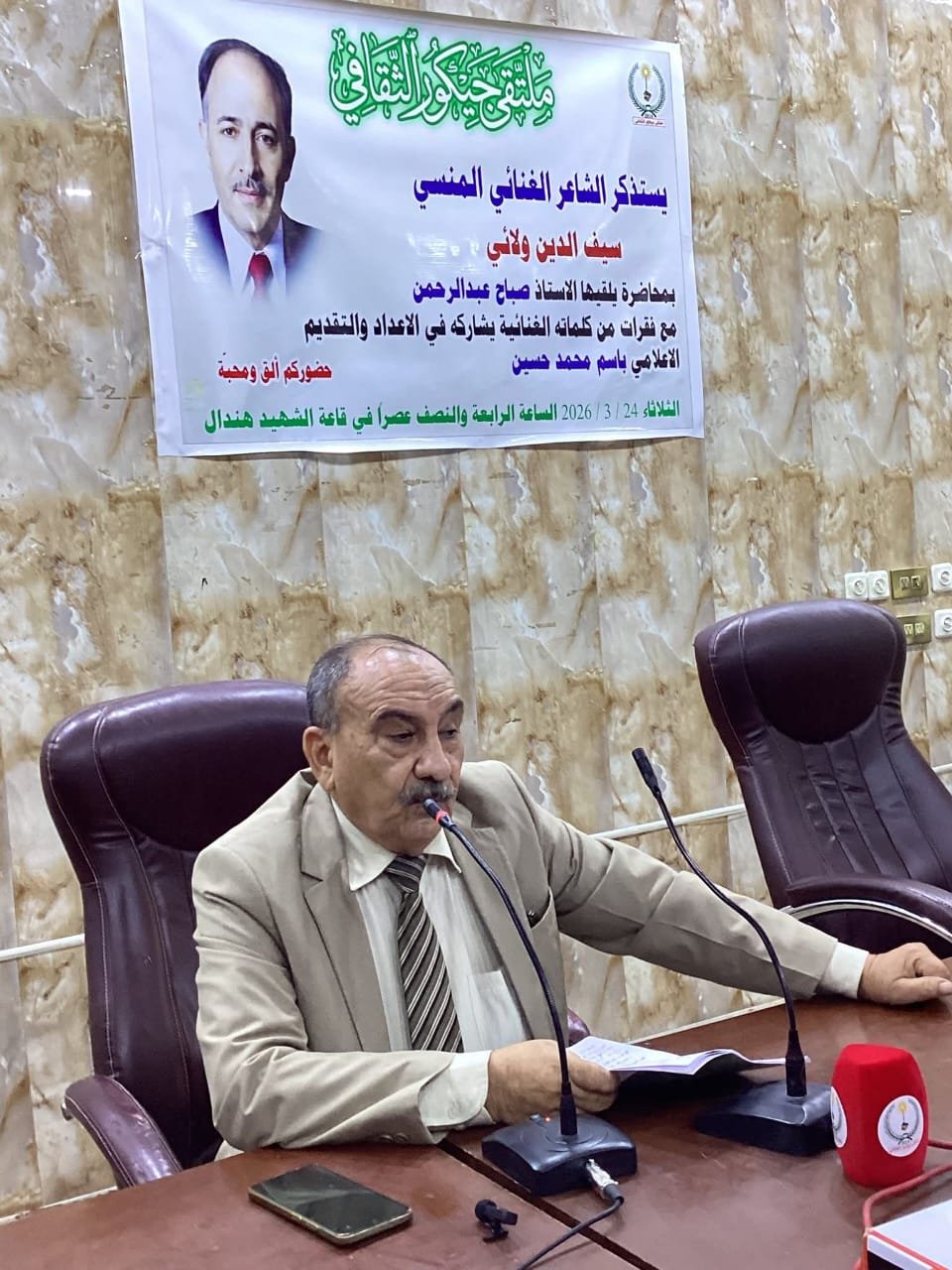 احتضنت قاعة الشهيد هندال في مقر محلية البصرة للحزب الشيوعي العراقي هذا اليوم الجلسة الثقافية والفنية لاستذكار الشاعر الغنائي سيف الدين ولائي وقد حضر الجلسة نخبة من الادباء والشعراء والفنانين ، حيث القى المحاضر الاستاذ صباح عبدالرحمن محاضرة استذمر فيها حياة واعمال الشاعر الغنائي المنسي صاحب كلمات الالف اغنية ( سيف الدين ولائي) وتناول محطات متعددة من حياته واهم اعماله الغنائية التي اضافت الى المكتبة الغنائية اهم الاغاني واعذبها .. وقد قدم الجلسة الاعلامي الاستاذ باسم محمد حسين ،وبعد حديث المحاضر صباح والاغنيات التي عرضها باسم شارك عدد من الحاضرين بمداخلات اغنت الجلسة التي تعتبر من الجلسات المتميزة.